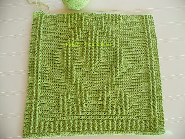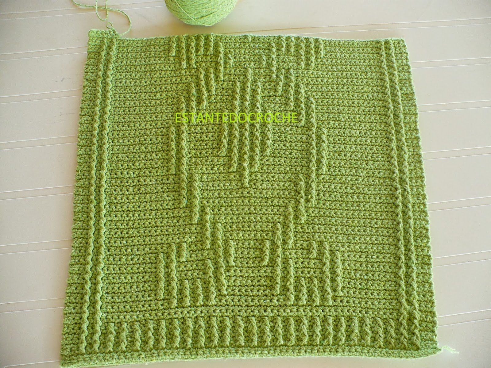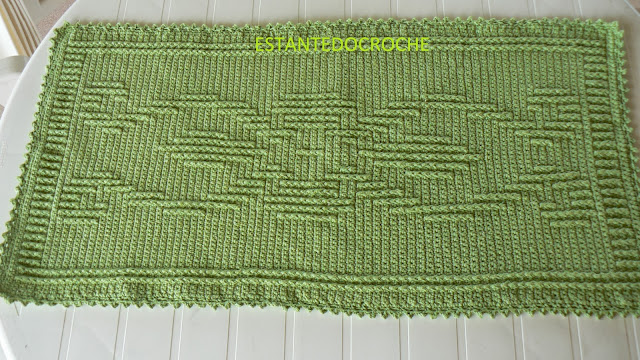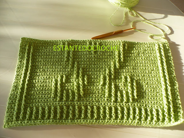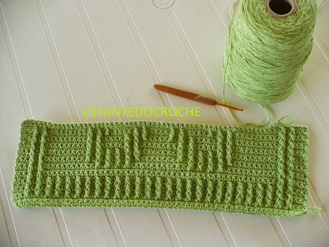Feito com pontos baixos e pontos altos enlaçando pela frente com ponto alto o ponto baixo duas carreiras abaixo.